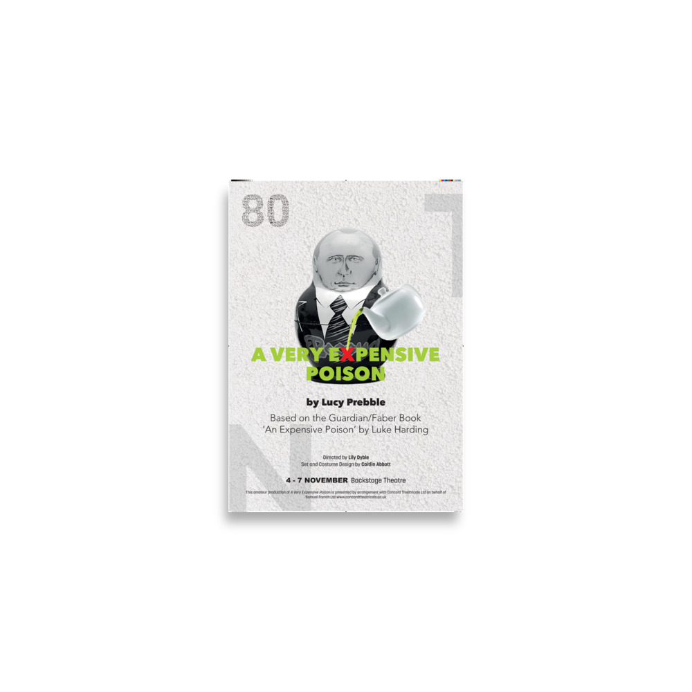A2 poster of Mountview's 2025 production of 'A Very Expensive Poison'. Museum-quality poster made on thick matte paper.