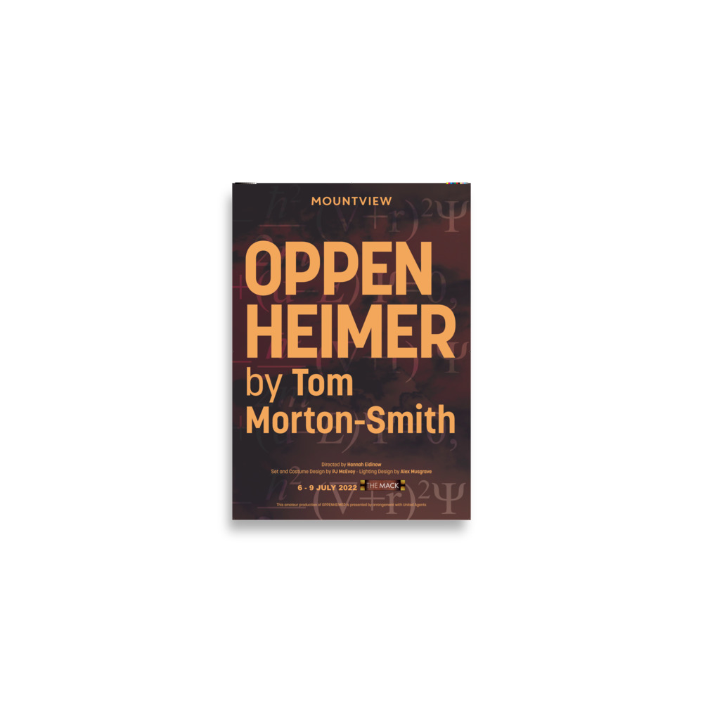 A2 poster of Mountview's 2022 production of 'Oppenheimer'. Museum-quality poster made on thick matte paper.