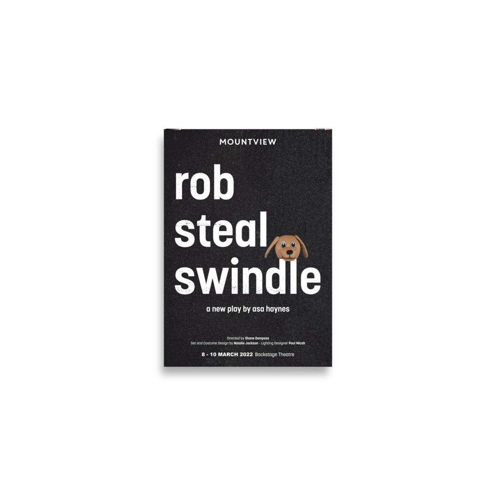 A2 poster of Mountview's 2022 production of 'rob steal swindle'. Museum-quality poster made on thick matte paper.